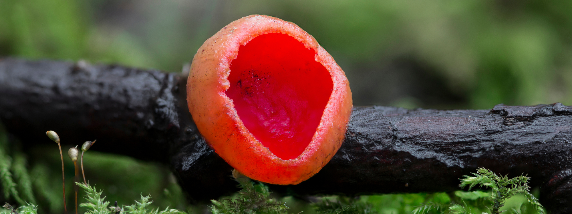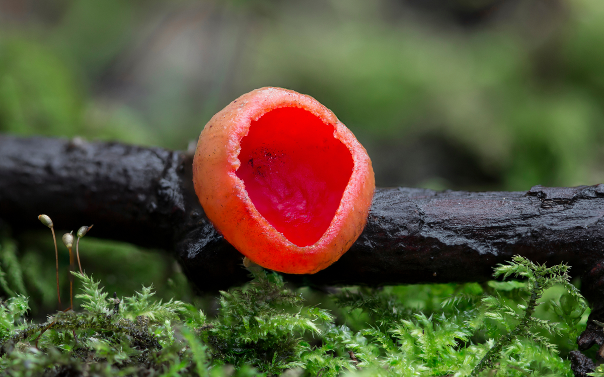 The cherry red cups grow on decaying sticks and branches in damp spots and beneath the leaf litter from December to April. In European folklore, it was said that wood elves drank morning dew from the cup!