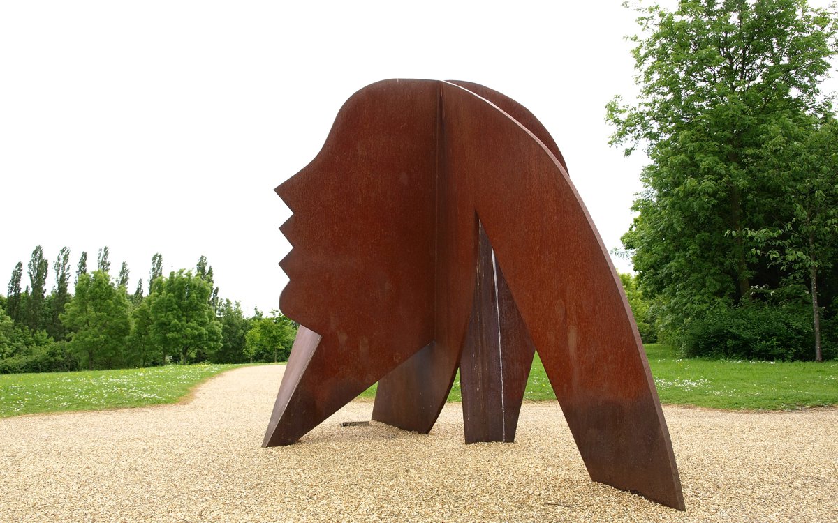 Head, by Allen Jones, is one of the over 220 publicly owned artworks in Milton Keynes. Over 30 of these are in the custody of the Parks Trust and of these, 13 are currently installed in Campbell Park. Jones’ early career was characterised by his pop art work in the 1960s. Walking around this Corten steel piece from 1990, we find the main head shape is bisected by others which are reminiscent of the high heels that found in Jones’ earlier work. While the sculpture provokes a less controversial discourse than his 1960s Chair, it nevertheless makes a powerful statement about how the human condition comprises abstract planes, complex angles, and thoughts and desires that can change with the weather.