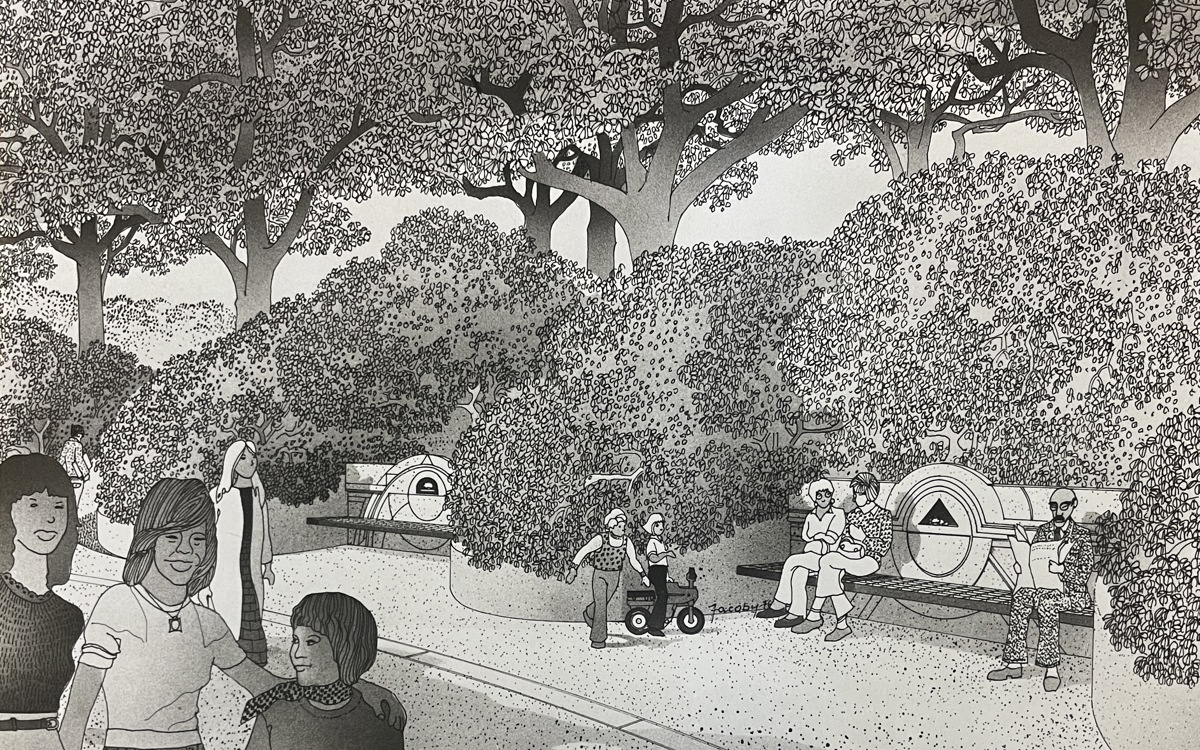 Image 4: Proposed City Park, drawing of seating area by Helmut Jacoby. Jacoby’s drawings bring fine detailed tone and texture to Mahaddie’s pantone colour fields. (Buckinghamshire Archives: D-MKDC/16/1/71/1853)