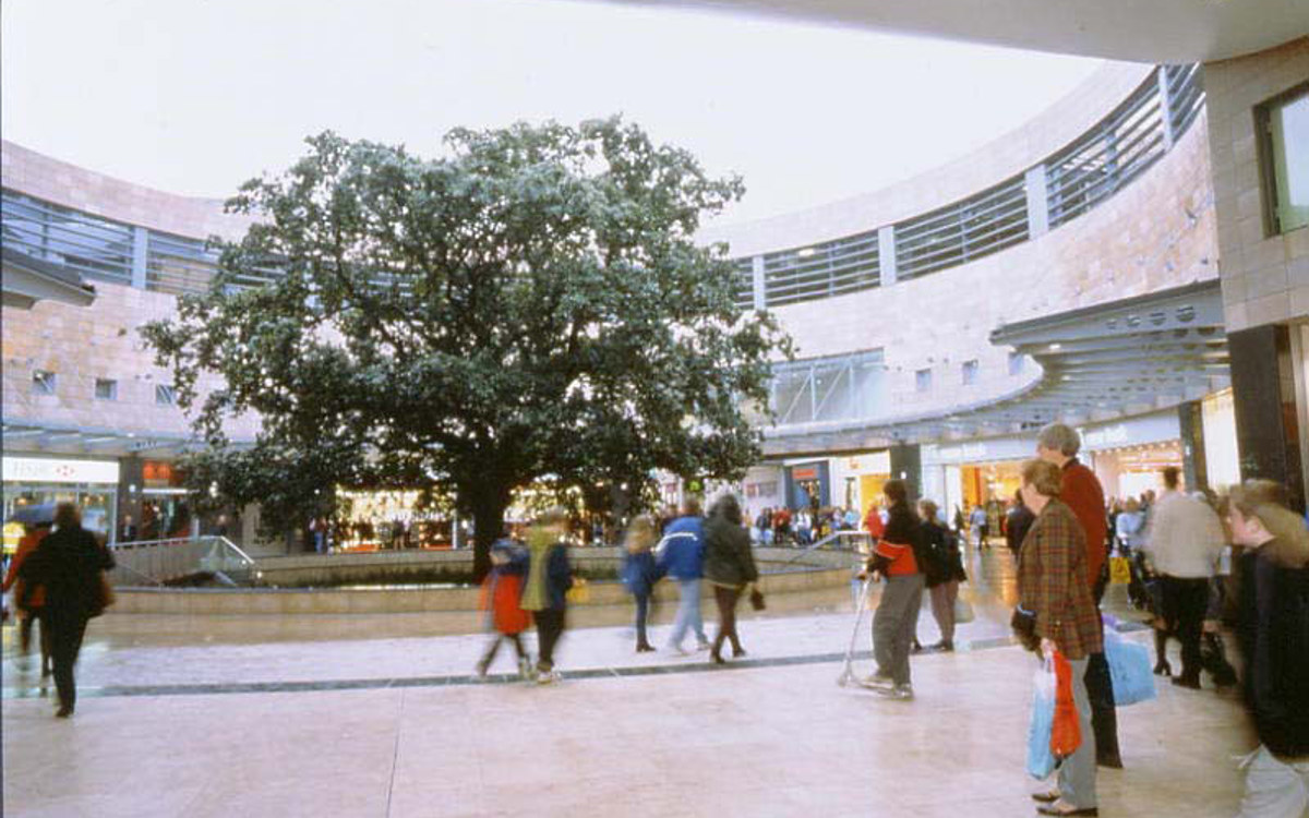 The designers of Midsummer Place created a circular area open to the sky around the oak so that visitors could still enjoy the tree. Photo © johnc@studiomk.co.uk. Image courtesy of the City Discovery Centre